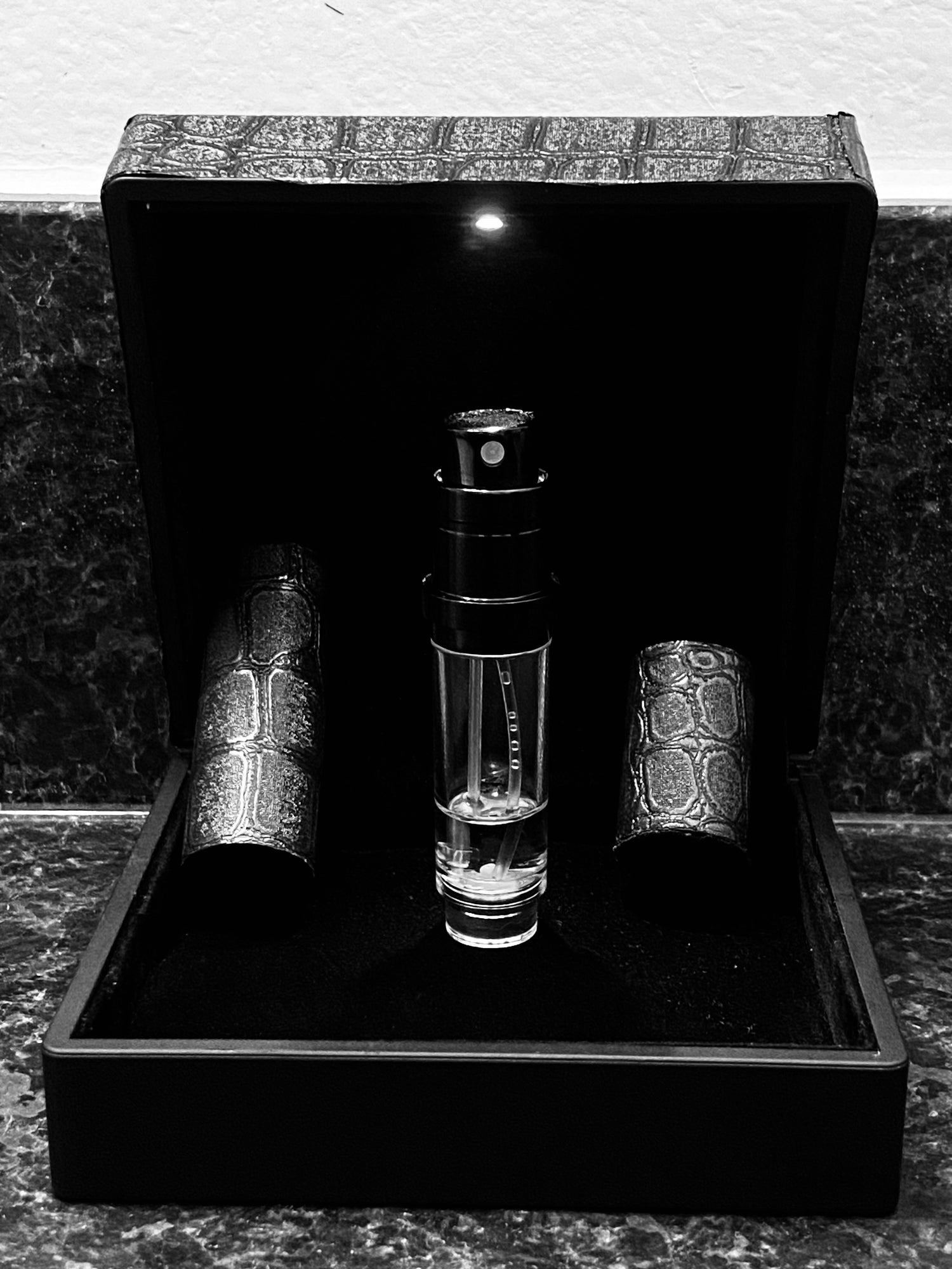 Patchouli, Pink Pepper and Bulgarian Rose....Elegantly wrapped in faux, black crocodile, our bottom-loading, luxury (5ml) atomizer is designed for effortless travel and discreet application on the go..